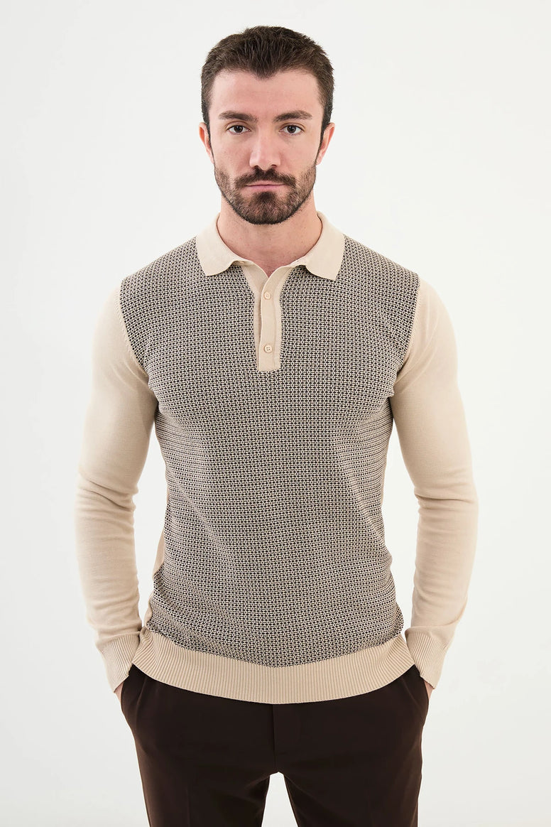 Elevate your Style with our Ames Patterned Wool Polo Sweater Beige