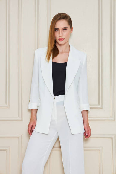 Discover Gent With Conroe Off White Crepe Suit. This off white suit for women is made of high quality crepe fabric. 2 piece Off White Suit comes with slim fit blazer and stylish pants. Make Conroe Off White Crepe Suit part of your wardrobe to look stunning at any event. We’re offering free worldwide shipping.