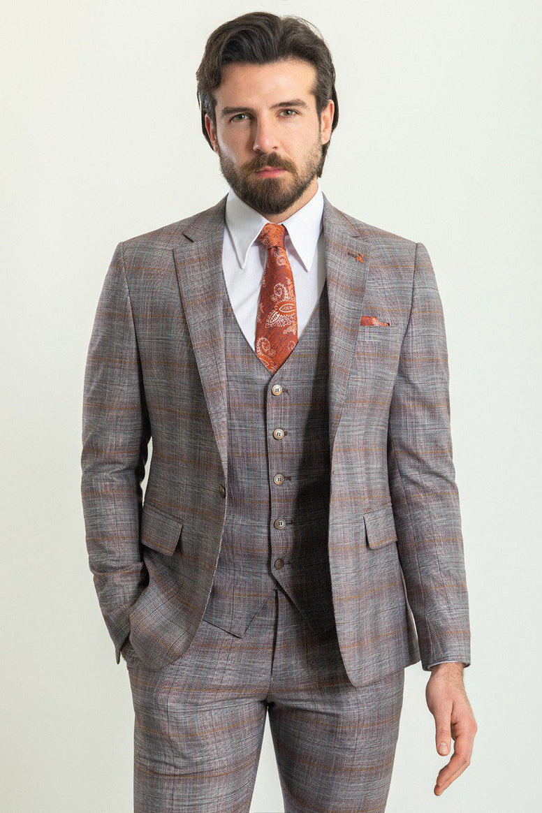 Elevate your Style with our GentWith Mitchell Burgundy Slim Fit Notch Lapel 3 Piece Crosshatch Plaid Suit