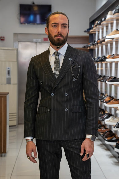 Sturgis Black Slim Fit 2 Piece Striped Double Breasted Suit Features: