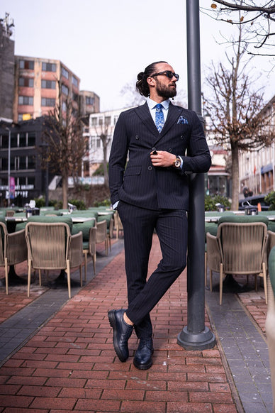 Tea Navy Blue Slim Fit 2 Piece Pinstripe Double Breasted Suit Features: