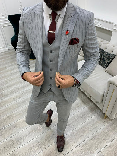 Yukon Gray Slim Fit Peak Lapel Striped Suit