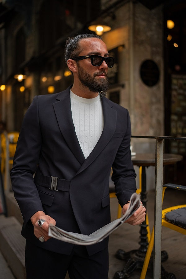 Experience unparalleled comfort and style with our Marion 2 Piece Metal Buckle Black Suit
