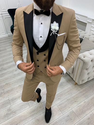 Molalla Slim Fit Velvet Peak Lapel Golden Tuxedo Features: