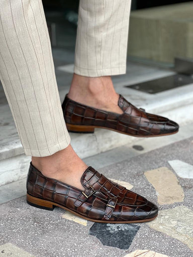 Tampa Crocodile Pattern Brown Double Monk Strap Shoes Features: