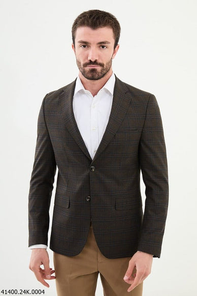 Experience unparalleled comfort and style with our Tea Brown Slim Fit Notch Lapel Men's Plaid Wool Blazer