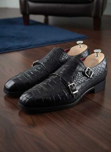 Featuring a double monk strap design with sleek metal buckles, these genuine leather shoes provide a secure, adjustable fit while offering a distinguished European-inspired appeal. The cap toe adds a sharp, professional touch, creating a polished silhouette that pairs effortlessly with tailored suits, dress trousers, and chinos. The soft leather lining and cushioned insole deliver superior breathability, all-day comfort, and support for extended wear.