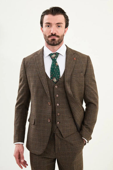 Designed with a tailored fit, it provides a sharp and polished silhouette that enhances your natural form. Whether worn for business meetings, weddings, or formal occasions, this men’s wool plaid suit ensures you make a lasting impression. The single breasted jacket and flat-front trousers maintain a clean, structured appearance that pairs effortlessly with a shirt or turtleneck for a contemporary twist. Refined, versatile, and impeccably crafted, the Brown Plaid Wool Suit is the perfect expression of modern luxury and timeless style.